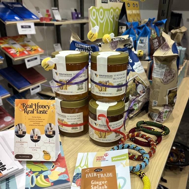 Siegen. Unsere Aktion der FAIREN WOCHE vom 15. September bis 26. September 2025 war diesmal eine Werbeaktion für den Stadtwaldhonig unserer Bienenvölker. Vor den Ferien haben Schüler*innen zusammen mit unserem Lehrer und Imker Herrn Schattenberg den Honig unserer zwei Bienenvölker geernet. Nun ist er in Gläsern abgefüllt, hat den Namen Stadtwaldhonig und ein wunderschönes Etikett […]